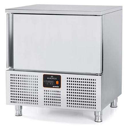 Capacidade para 5 tabuleiros GN1/1 e 600×400 mm (EN1), distância entre guias 65 mm.