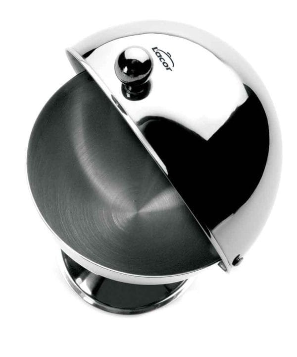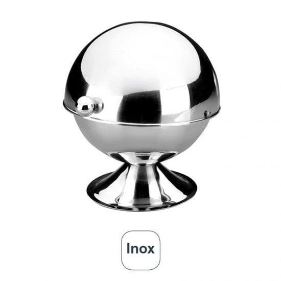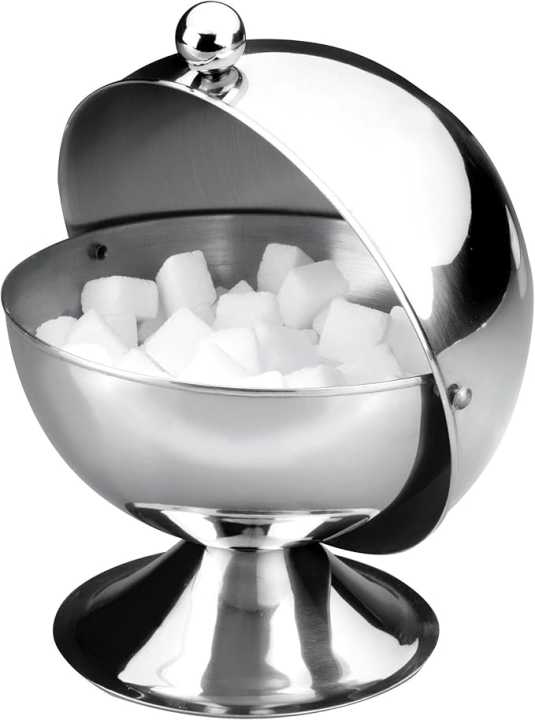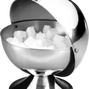 Açucareiro com tampa de 600 ml de capacidade e 14 cm de diâmetro, fabricado em aço inoxidável de grande qualidade e resistência à corrosão.