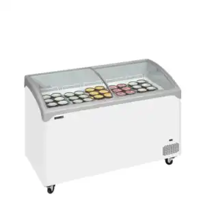 A gama premium de congeladores de gelados NIC tem um excelente design com cantos curvos, arestas arredondadas e tampas de vidro deslizantes curvas. Estes congeladores são muito estáveis e de construção sólida, mas ao mesmo tempo incorporam rodízios para um fácil reposicionamento na loja. São ideais para expor alimentos congelados, incluindo gelados e picolés. Está disponível um conjunto completo de cestos.