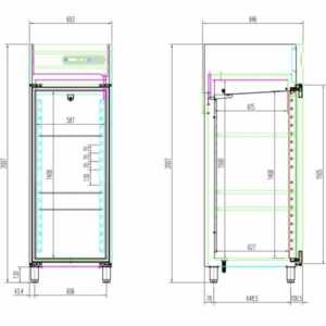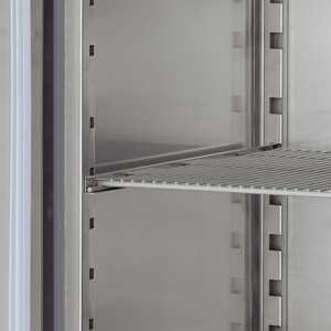 Câmara frigorífica com compartimento de congelação série GN 2/1: O compartimento de congelação está equipado com 3 gavetas interiores, feitas de PVC higiénico sobre corrediças de aço inoxidável.