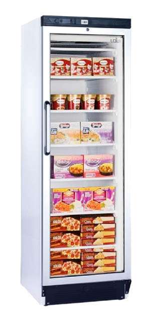 Armário vertical para congelação com 1 porta de vidro; Sem display; Refrigeração estática com ventilador de apoio.