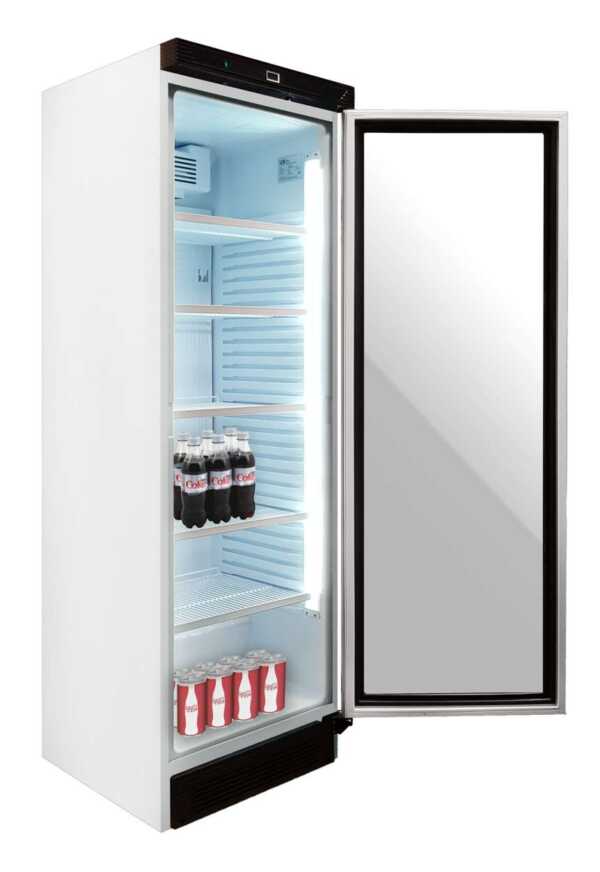 Construção em skinplate; Sem display; Porta Vidro; 5 Prateleiras ajustáveis; Capacidade de 372Lt.; Refrigeração ventilada; Inclui fechadura
