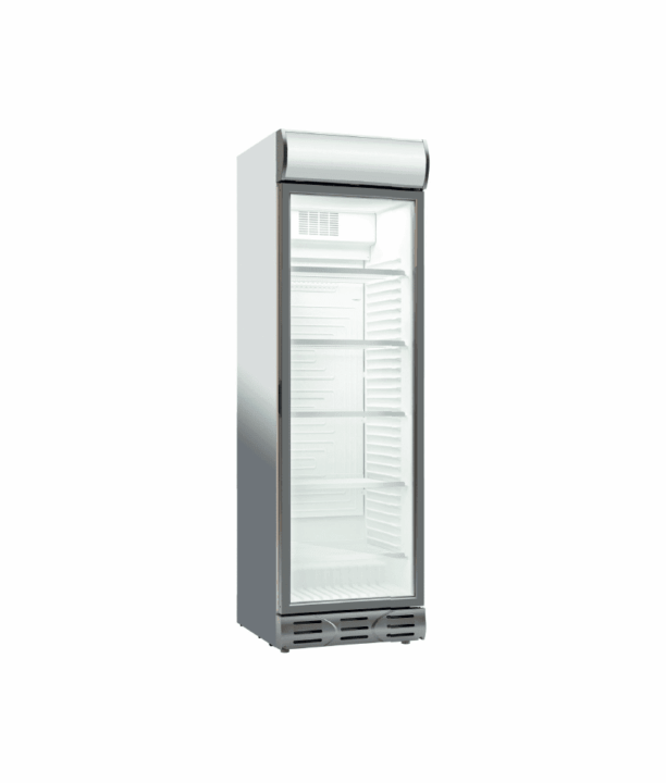 Armário vertical expositor refrigerado, com dispay superior iluminado e 2 portas de abrir em vidro duplo. Perfeito para colocar bebidas e alimentos lojas, mercearias e self-services. Refrigerante R600a e temperatura interior de 0ºC a +10 ºC.