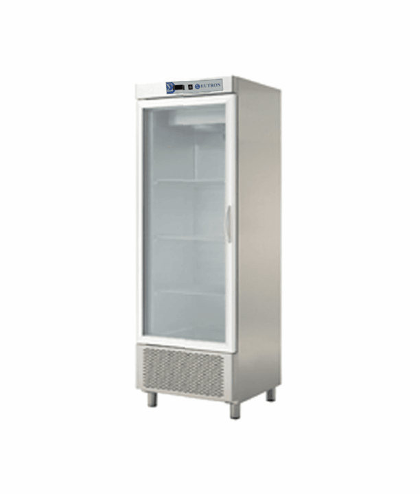 Armário vertical refrigerado com estrutura exterior e interior em aço inox, 1 porta de vidro, pés niveladores em aço inox, termostato digital, temperatura interior de -2ºC a +8ºC à temperatura ambiente +38ºC.