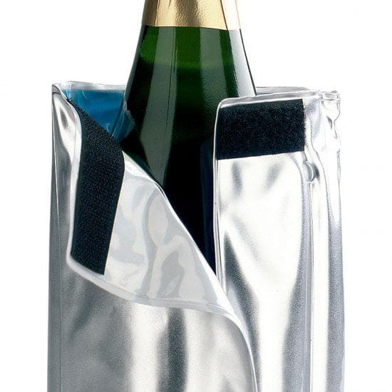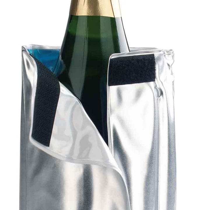 Luva de gel com fecho de velcro para arrefecer uma garrafa de vinho, espumante ou similares. Adaptável à maioria de garrafas de 0,7 e 1 litro.