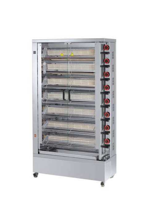 Assador vertical a gás, com duas portas pivotantes e duas pegas, preparado para gas butano/propano ou gás natural, espetos rotativos, modelo especial para assar frango aberto.