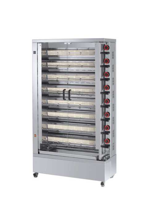 Assador vertical a gás, com duas portas pivotantes e duas pegas, preparado para gas butano/propano ou gás natural, espetos rotativos, modelo com três ganchos centrais e dois ganchos laterais.