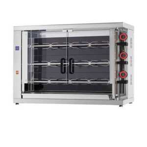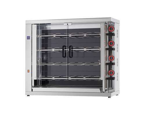 Assador de frangos vertical, equipado com resistencias elétricas de grande potência protegidas com cristal vitrocerámico para facilitar a limpeza.