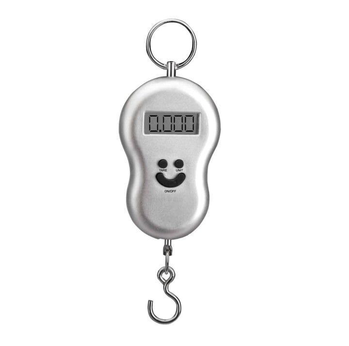 Balança com o gancho para fazer medições de até 10 kg com divisão de 5 gramas.
