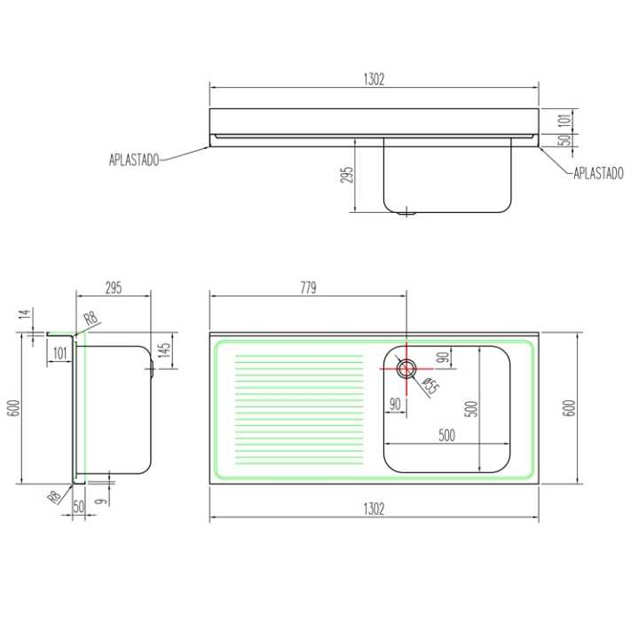 Encimeras com profundidade de 600 mm com pia e borda traseira de 100 mm de altura totalmente soldada.