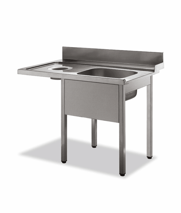 Mesa de entrada em aço inox AISI 304, com alçado posterior, furo detritos e 1 cuba.