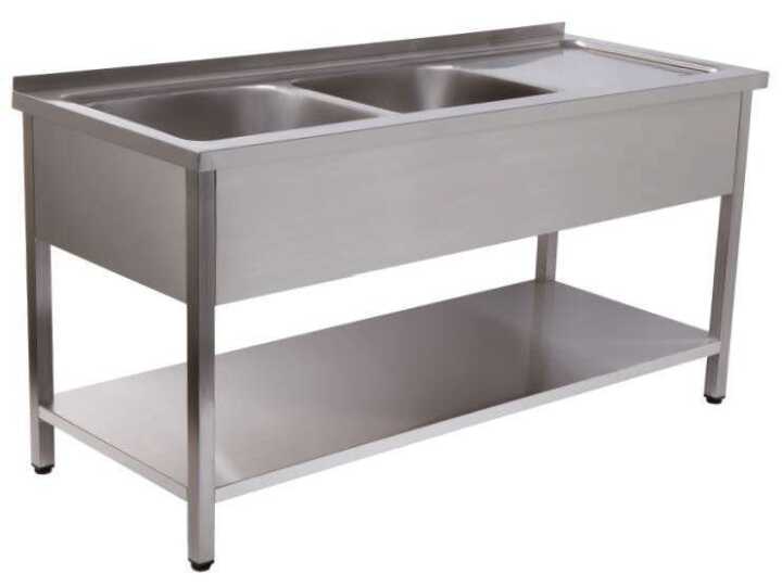 Bancada de lavagem em aço inox com duas cubas, desmontada.