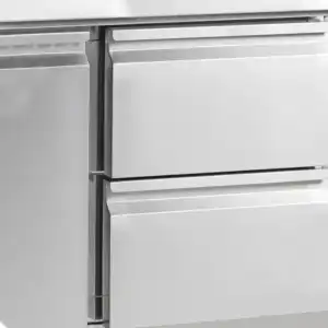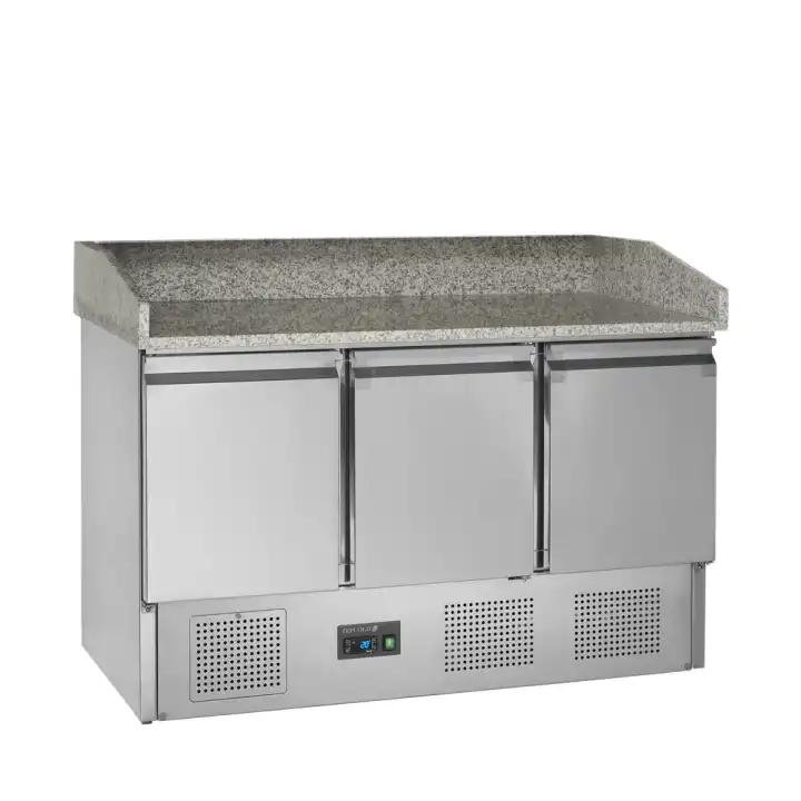 A gama de mesas de pizza PT é fabricada em aço inoxidável SS304. Tem um tampo em granito, ideal para a confeção de pizzas, uma vez que se mantém fresco e dificulta a aderência da massa. Estão disponíveis em vários tamanhos, com 2 ou 3 portas. Também é possível personalizá-las com gavetas. Disponíveis com ou sem porta-condimentos para bandejas GN1/3 os porta-condimentos também podem ser adicionados posteriormente.