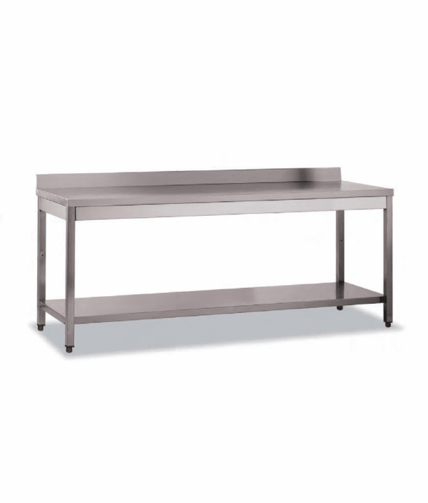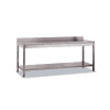 Bancada em aço inox AISI 304 com alçado e prateleira inferior.