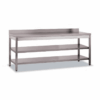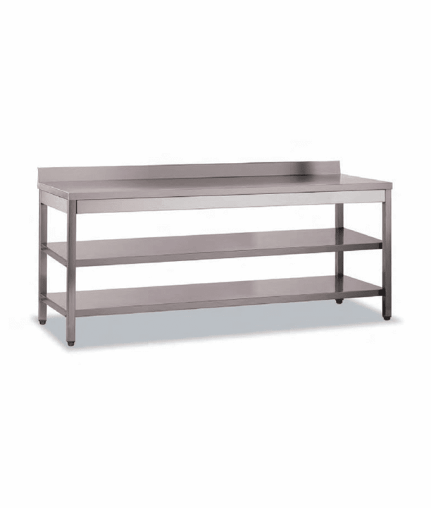 Bancada em aço inox AISI 304 com alçado, prateleira inferior e intermédia.