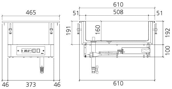 Cubas banho-maria de funcionamento com água, com 190 mm de profundidade.