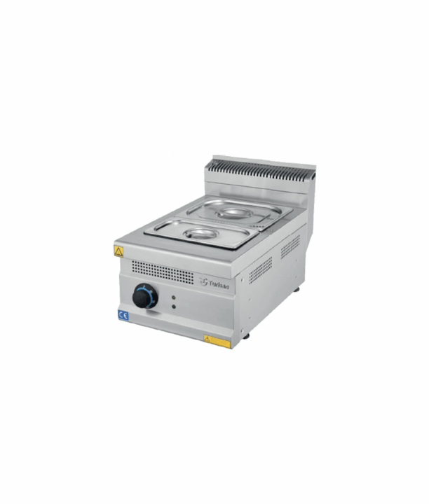 Banho-maria elétrico de bancada com capacidade para 2 containers (1xGN 1/2 – 150mm e 1xGN1/3 – 150mm), estrutura em aço inoxidável, termóstato de temperatura ajustável +30°C a +120°C e pés niveladores.