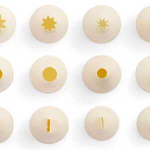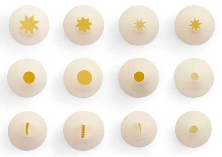 Conjunto de 12 bicos diferentes para cobertura, numa caixa.