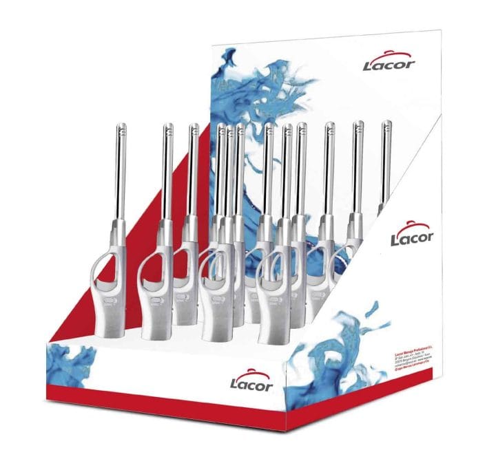 Caixa expositora com 12 isqueiros a gás, recarregáveis de 27 cm de comprimento e de cana-fixa ideais para acender fogueiras em fogões a gás.