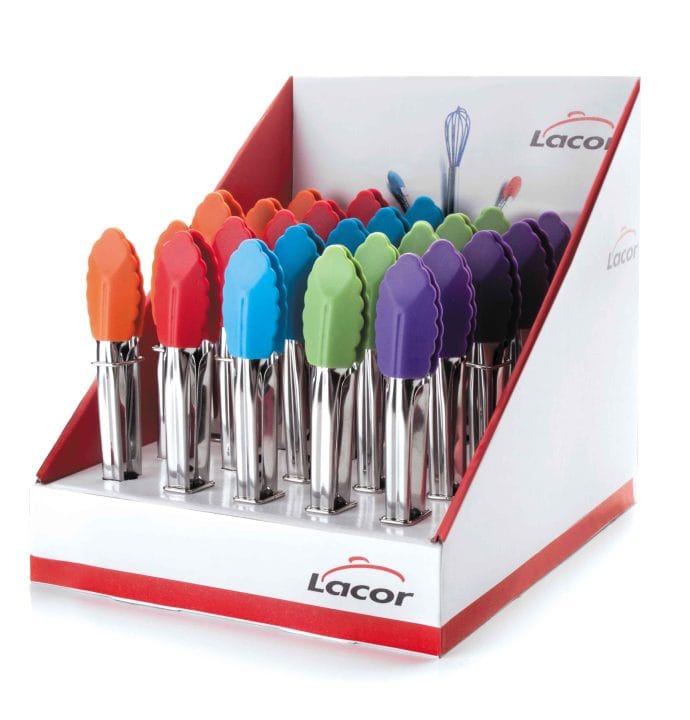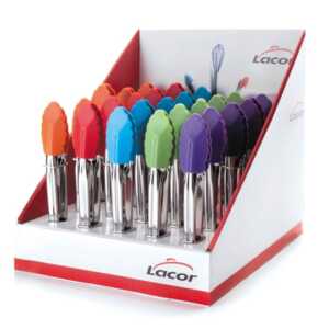 SKU: LA64434Caixa display de 25 pinças de 18 cm de comprimento em silicone de diferentes cores e cabo de aço inoxidável. Ideal para cozinhar ou para bolos.