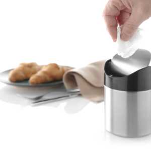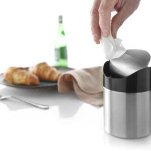 Com parte superior em plástico e tampa basculante em aço inoxidável.