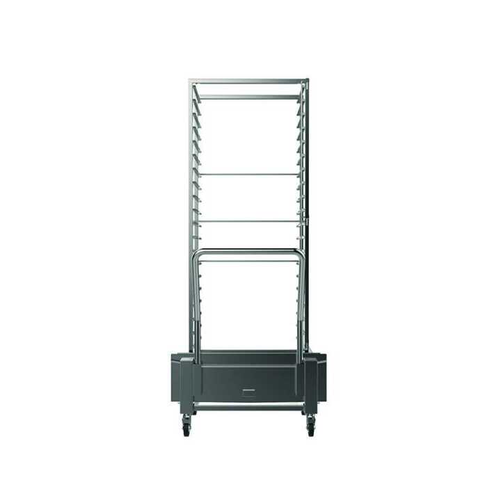 Carro para gastronomia extraível em aço inox com capacidade de tabuleiros 20×1/1 GN, com alça ergonômica removível e rodas com freios.