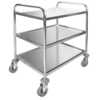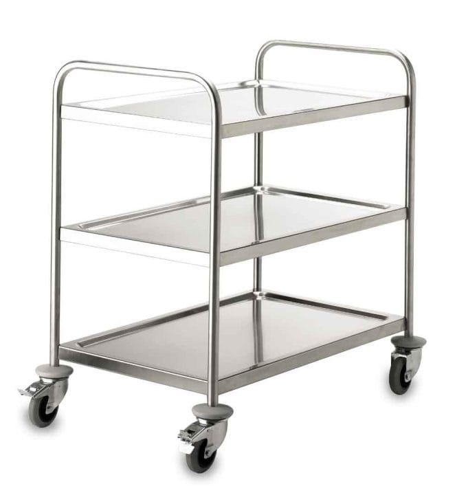 Caminhão de serviço de cozinha com 3 bandejas soldadas não desmontáveis, e fabricado em aço inoxidável de grande qualidade. Ideal para hotelaria e caterings.