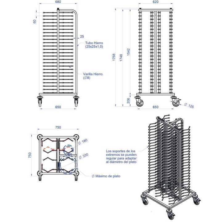 Quatro (4) rodas de 125 mm de diâmetro, dois (2) deles com freios para uso mais seguro.