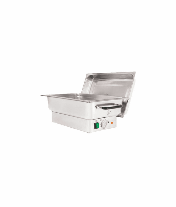 Chafing Dish elétrico GN1/1 com estrutura em aço inoxidável. Termostato de controlo de temperatura, bandeja de água para aquecimento do container GN1/1-100 e temperatura máxima 90°C.