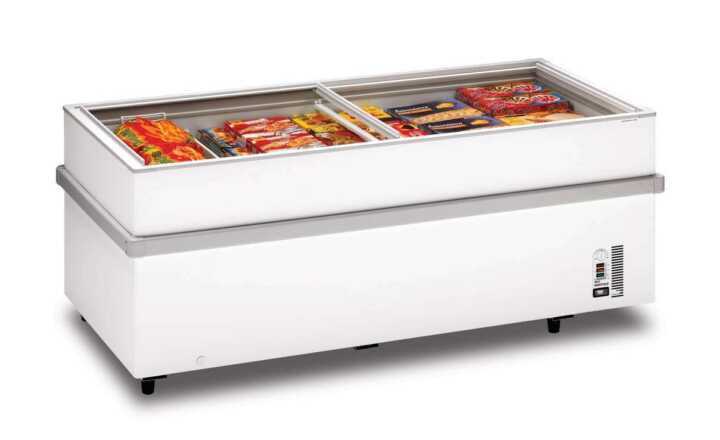 Exterior: chapa galvanizada revestida a pvc. Interior: chapa revestida a pvc atóxico.Evaporador e condensador em tubo de cobre.Tampas de correr em vidro térmico.Perfil de proteção ao choque.2 grupos frigoríficos.temperatura:-18º/-20ºc;volume:674Lt