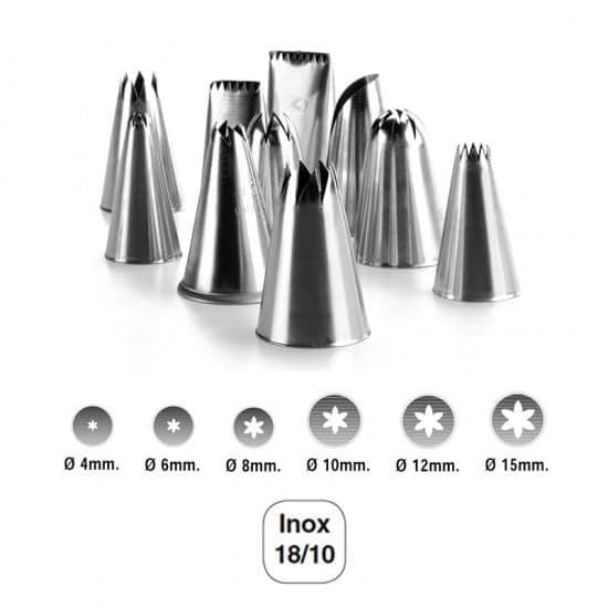 Conjunto de 6 bicos de confeitaria para saco de confeitar com forma de rosa e fabricadas em aço inoxidável 18/10 de alta qualidade e resistência à corrosão. Medidas: 4/6/8/10/12/15 mm.