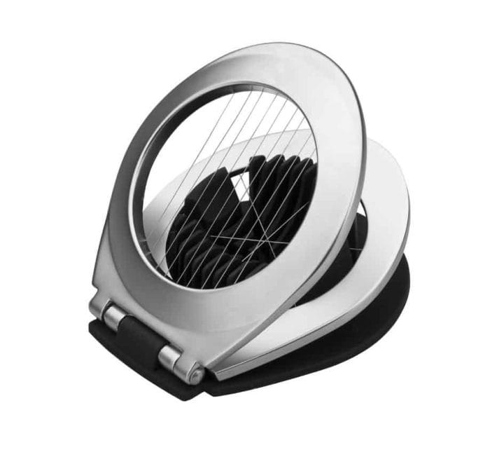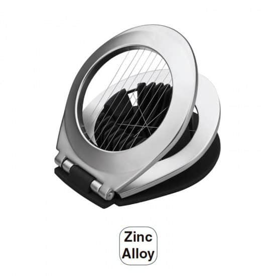 Cortahuevos de 7 cm de diâmetro, com dois tipos de corte fabricado em liga de zinco acabamento cromado e base de plástico TPR.