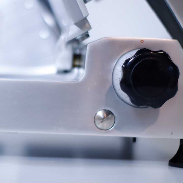 Cortadores profissionais de fiambres por gravidade, feitos de liga de alumínio anodizado.