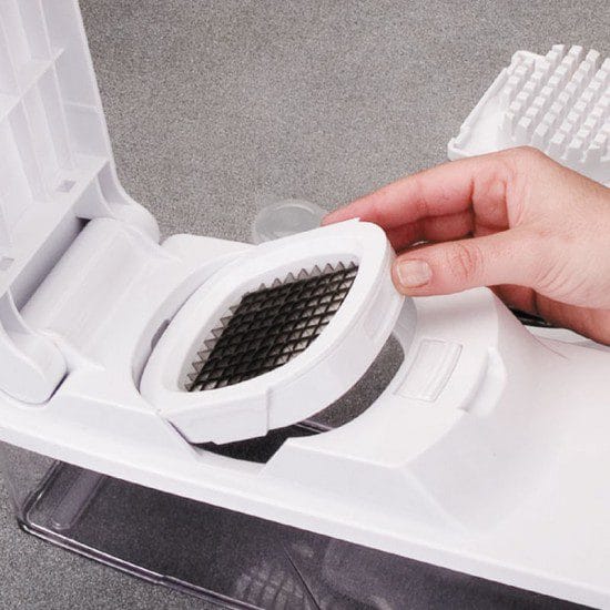 Cortador jornais de legumes e batatas fritas, com recipiente e acessórios para vários tipos de corte. Fabricado em plástico PLÁSTICO resistente e lâminas de aço inoxidável. Medidas: 11,5×21,5×11 cm
