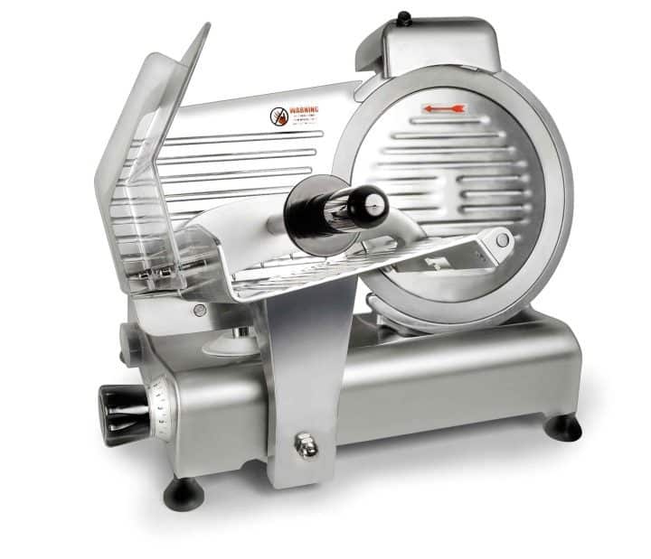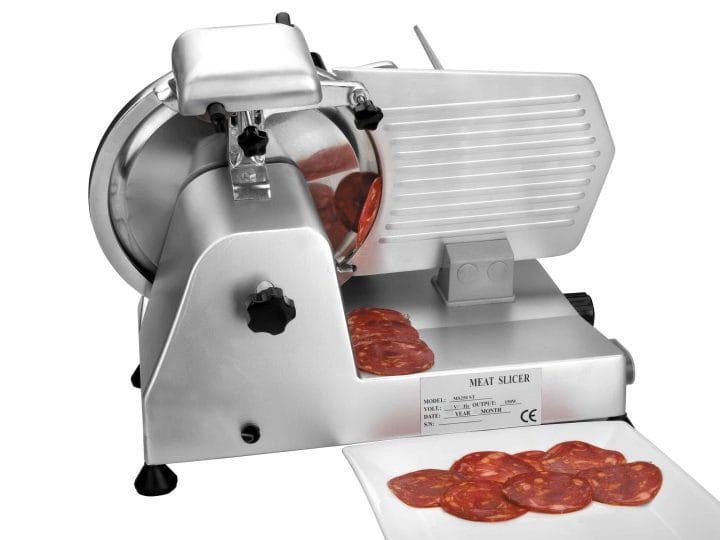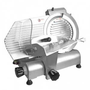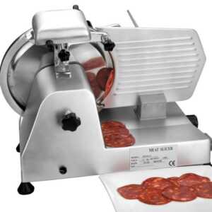 Cortadora de carnes frias elétrica profissional de 150 W fabricada em aço inoxidável 18/10, com disco de corte de 250 mm.