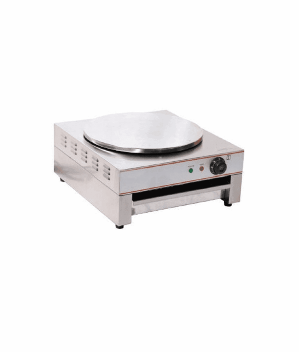Máquina de crepes elétrica com 1 placa de superfície anti-aderente, construção em aço inoxidável, utilização e limpeza fáceis.
