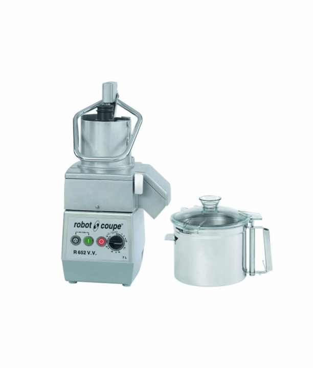 Cutter e cortadora de legumes com tampa fácil de posicionar sobre a cuba para utilização simples e rápida. Prevista para permitir acrescentar ingredientes líquidos ou sólidos durante a preparação.