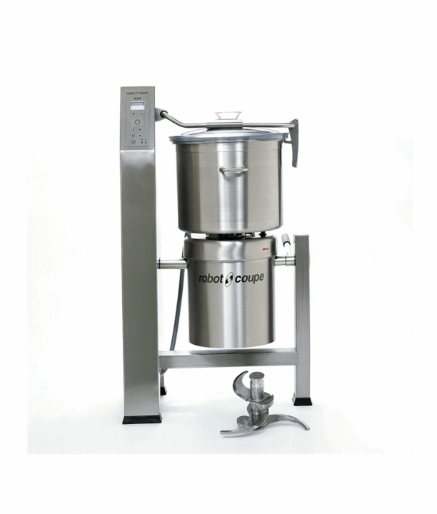 Cutter vertical com tampa transparente para permitir o controle das operações realizadas. Permite adicionar líquidos ou ingredientes durante o processo