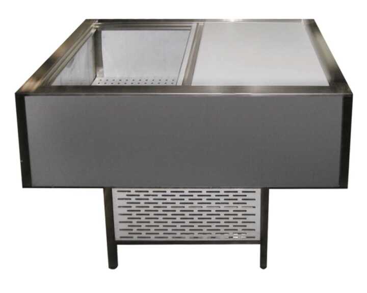 Cuba inox com isolamento em poliuretano de alta densidade com 40Kg/m3; Tampas de correr inox para acesso; Sistema de refrigeração constituído por grupo compressor hermético arrefecido a ar forçado e placa fría com tubo de cobre de 3/8 nas paredes do tanque interior; Controlo e visualização da temperatura atravês de microprocessador electrônico; Programador horário e válvula de entrada de água automática com saída de água salgada por tubo de esgoto; Tubo próprio para saída de água de limpeza do tanque; Chapa inox perfurada no fundo para apoio.