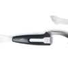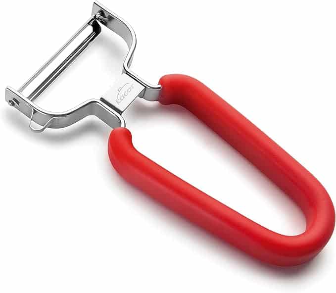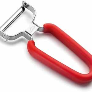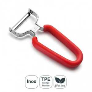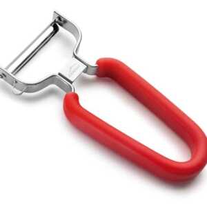Descascador de batatas em “E” de 12,5 cm de comprimento, fabricado em aço inoxidável de alta qualidade com punho em termoplástico vermelho.