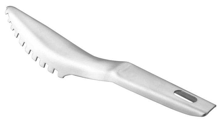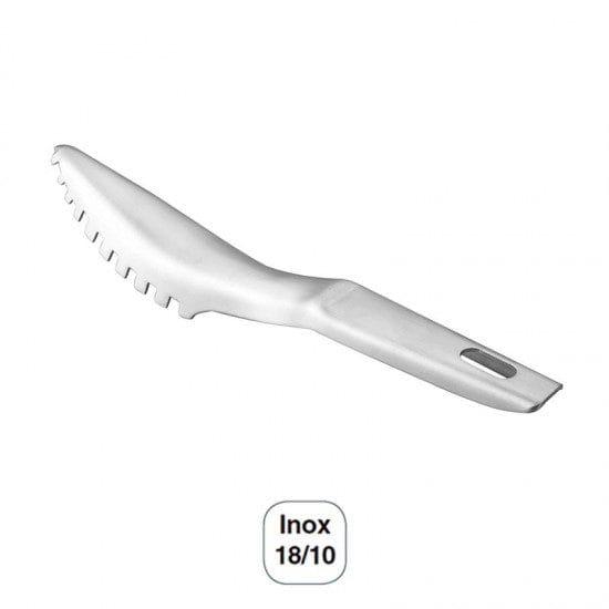 Desescamador para peixes de 19 cm de comprimento, fabricado em aço inoxidável de grande qualidade e resistência à corrosão.