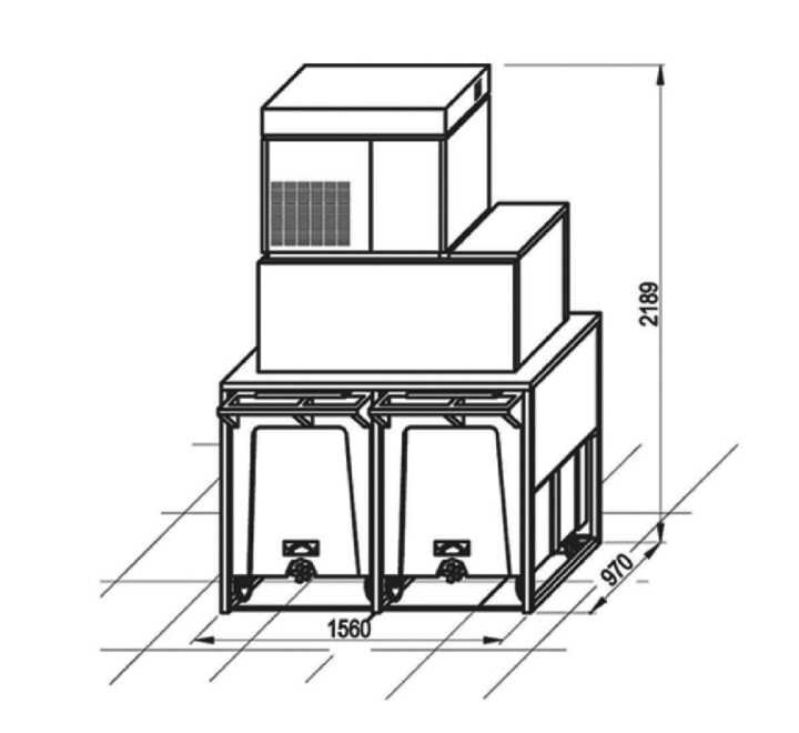 Moldura de suporte de aço inoxidável 18/8 sobre a qual são suportados: a caixa de armazenamento da tremonha intermediária sem o carrinho e a máquina de fazer gelo