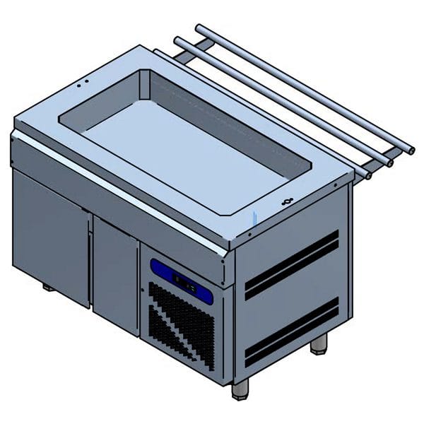 Os modelos com reservatório incorporam um reservatório refrigerado com guias para recipientes GN 1/1, enquanto os modelos sem reservatório têm um espaço aberto com uma prateleira inferior.