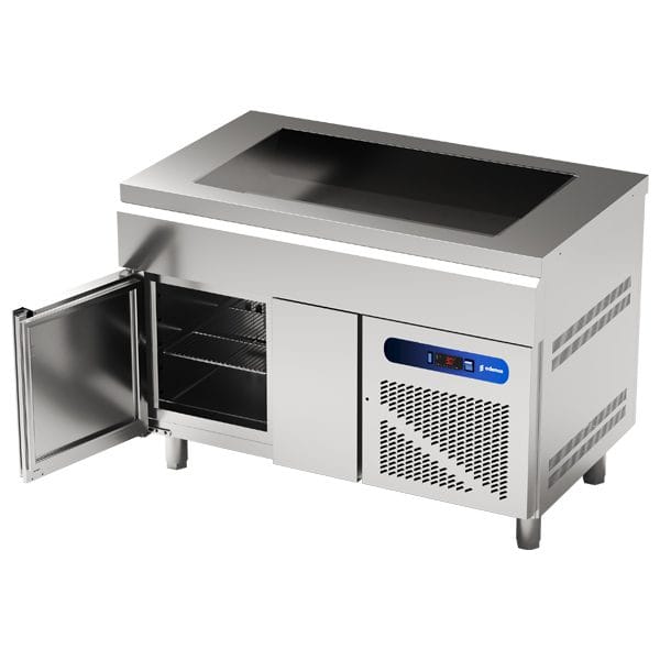 A cuba está igualmente preparada para a instalação de um expositor refrigerado SVF-16 e pode acolher até 5 prateleiras GN 1/1 no seu interior.
