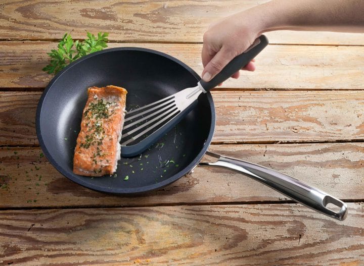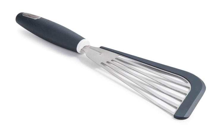 Sua borda chanfrada e revestido de silicone ajuda a deslizar debaixo dos alimentos, sem danificar a superfície antiaderente de frigideiras, placas, etc
