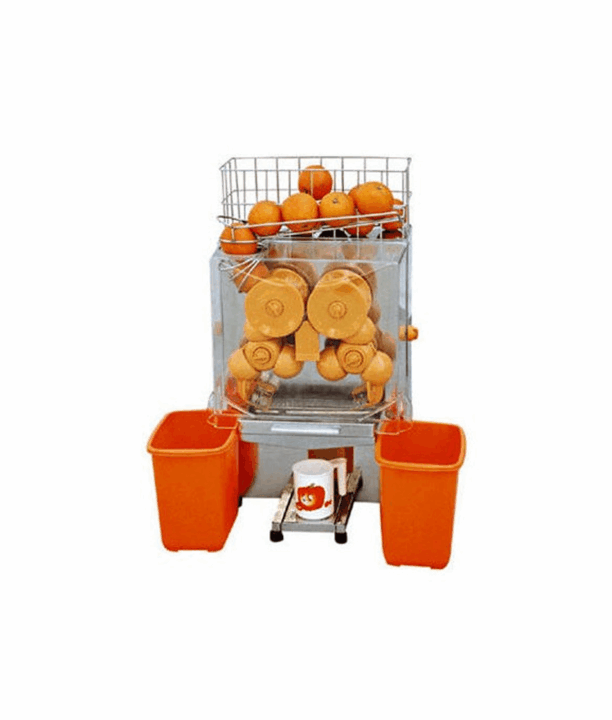 Espremedor automático de laranjas com 2 depósitos em PVC para desperdícios das laranjas. Máquina versátil e funcional que evita que a acidez e óleos da crosta se misturen com a suco da laranja.