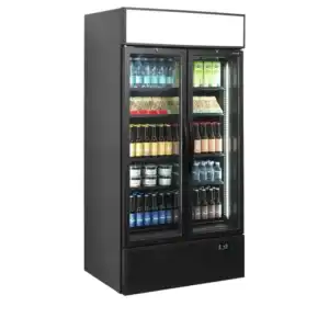 A gama FSC BLACK de expositores refrigerados pretos de 2 portas com uma cobertura iluminada oferece uma excelente qualidade de construção a um preço competitivo. Apresenta um aspeto contemporâneo, com interior e exterior pretos e portas de vidro com moldura em alumínio preto. As prateleiras são ajustáveis, o que faz da gama FSC uma solução flexível. Obtém uma excelente apresentação do produto, combinada com um potente sistema de arrefecimento assistido por ventoinha, controlado por um termóstato eletrónico. Muitos modelos também estão disponíveis sem cobertura (gama FS).