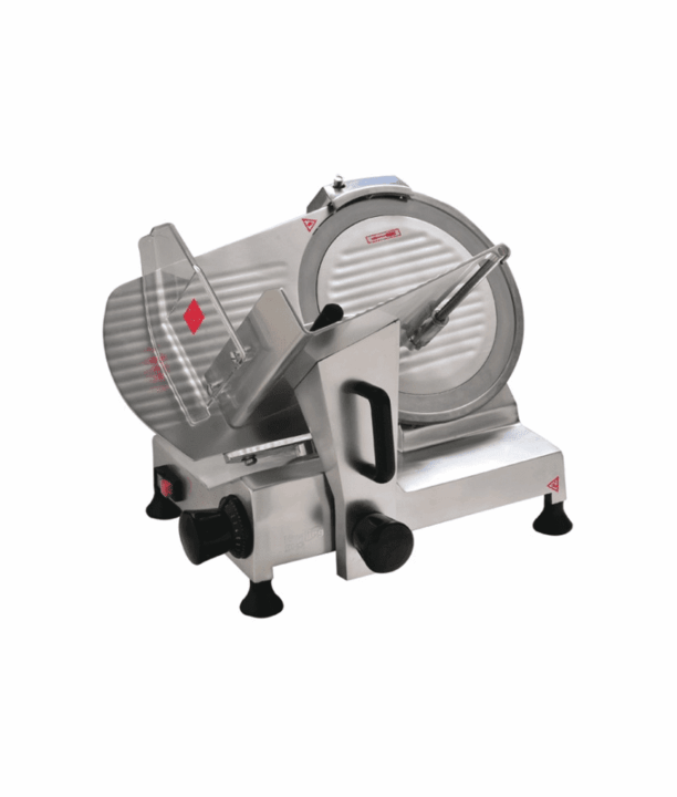 Cortadora de carnes frias com transmissão por correia, fabricada em alumínio lacado. Equipada com comandos elétricos, botão de paragem de emergência e afiador incorporado de série.
