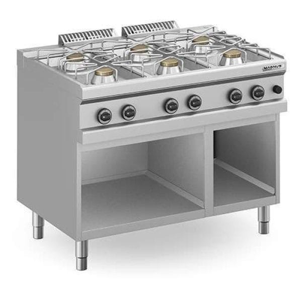 Queimadores em fundição cromada com espalhador de dupla chama, chama auto-estabilizadora e chama piloto.