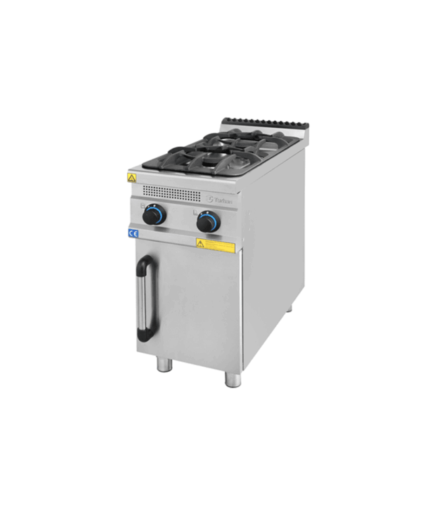 Fogão a gás com 2 queimadores e grelhas em ferro fundido. Estrutura em aço inoxidável com base inferior neutra, porta de abrir com puxador e pés niveladores.